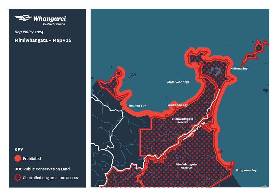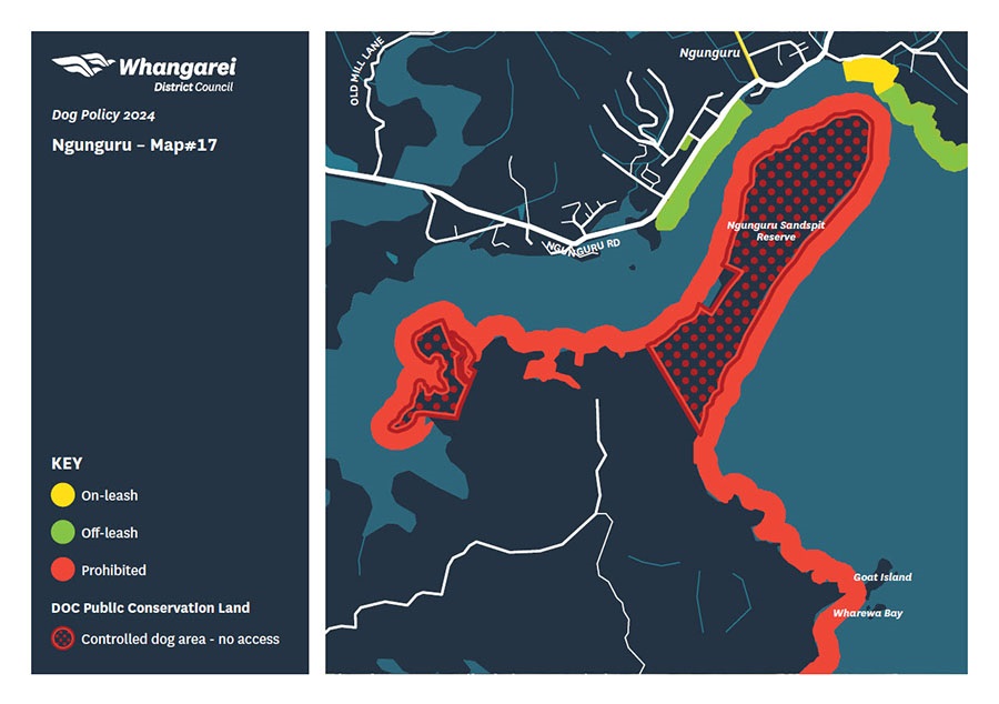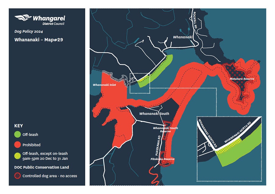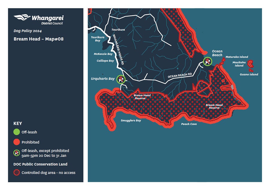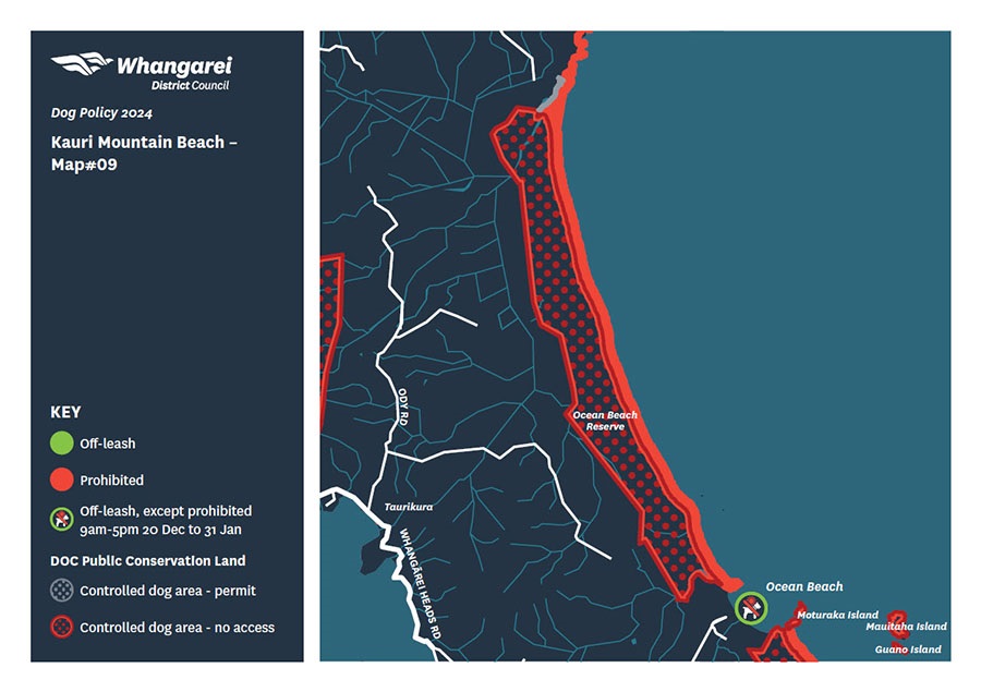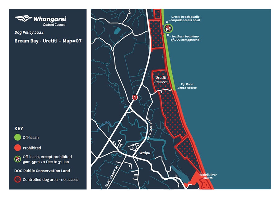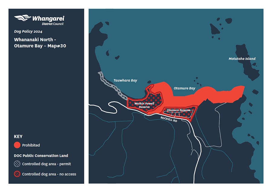 The Whangārei District has 38 prohibited sites for dogs, usually coastal areas where wildlife is particularly vulnerable. These areas will be signposted, but it’s your responsibility to check before visiting any beach. The council’s online map shows all dog access rules across the district, and you should consult this before heading out with your dog. Not included in the maps below is Whale Bay and Matapōuri Reserve – on Matapōuri Reserve (including access track to Whale Bay) and Otito Reserve at the northern end of Matapōuri Bay.