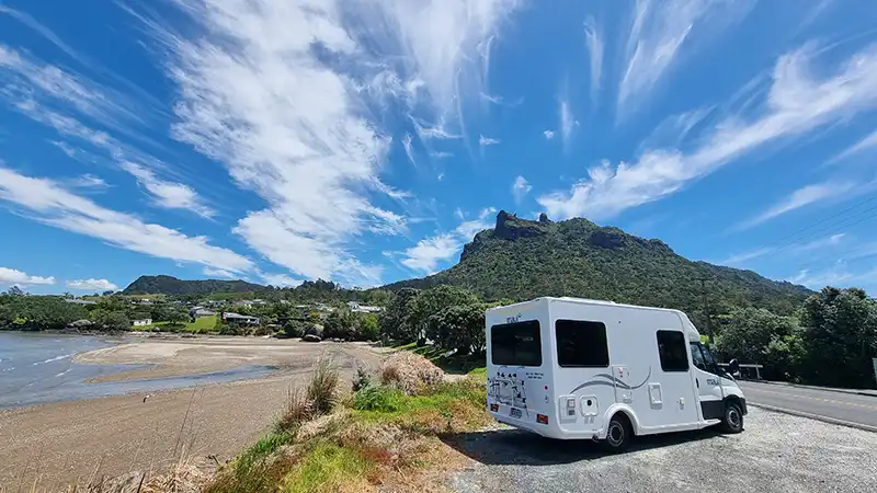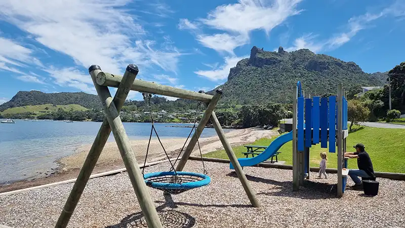 The dramatic backdrop of Mount Manaia adds to the beauty of the area and offers an excellent hiking opportunity just a short drive away. Holiday homes and baches dot the coastline, making it a popular spot for longer stays.